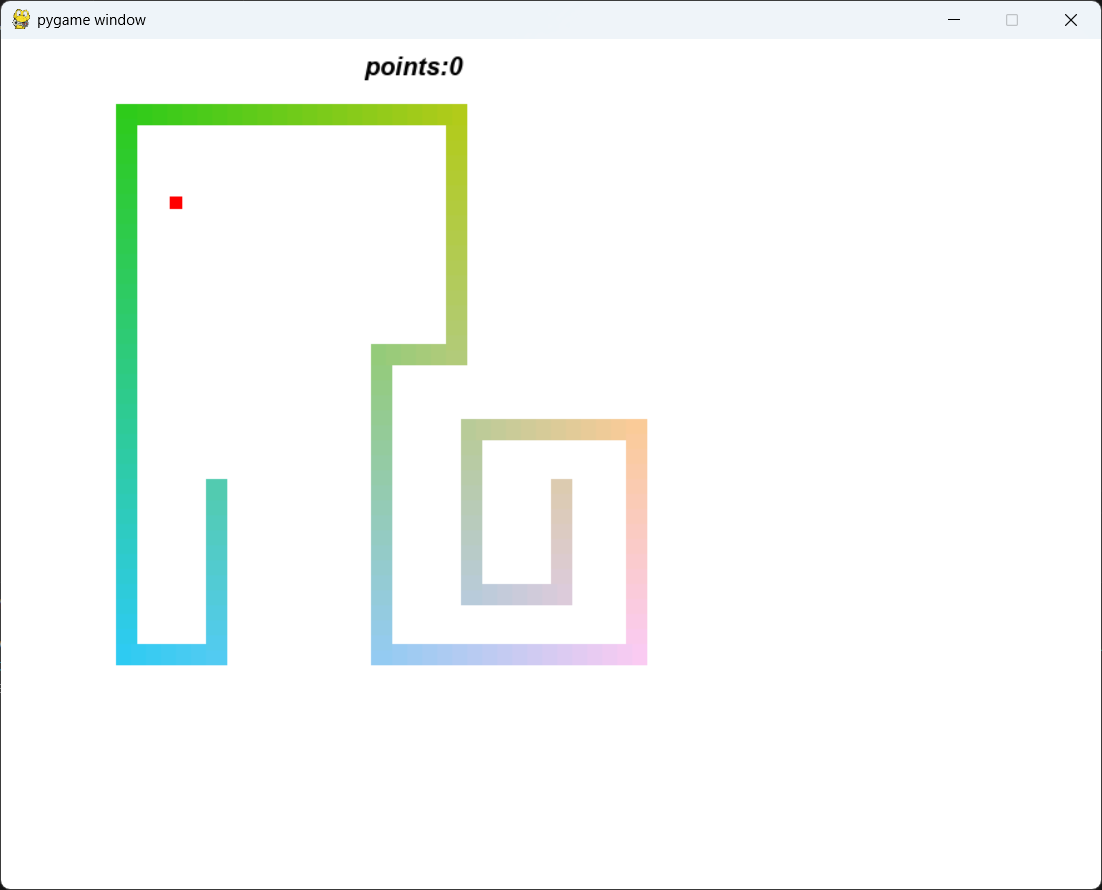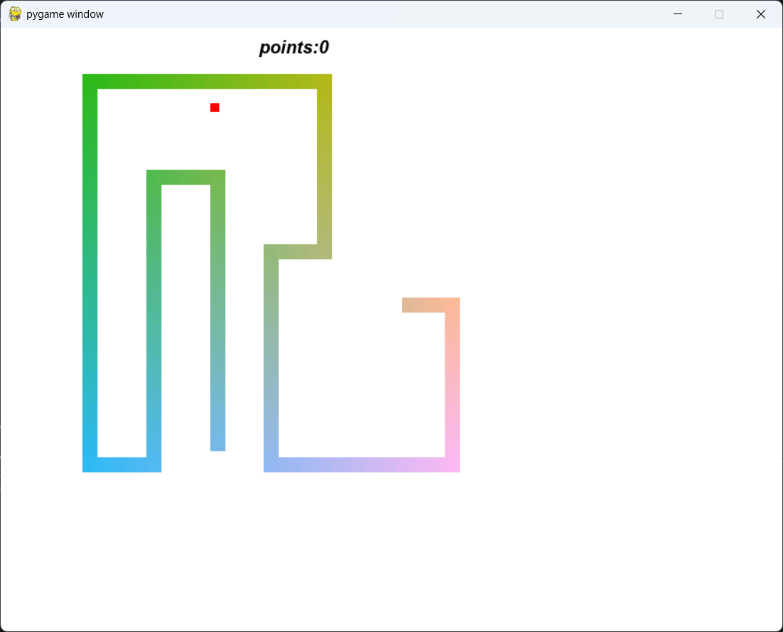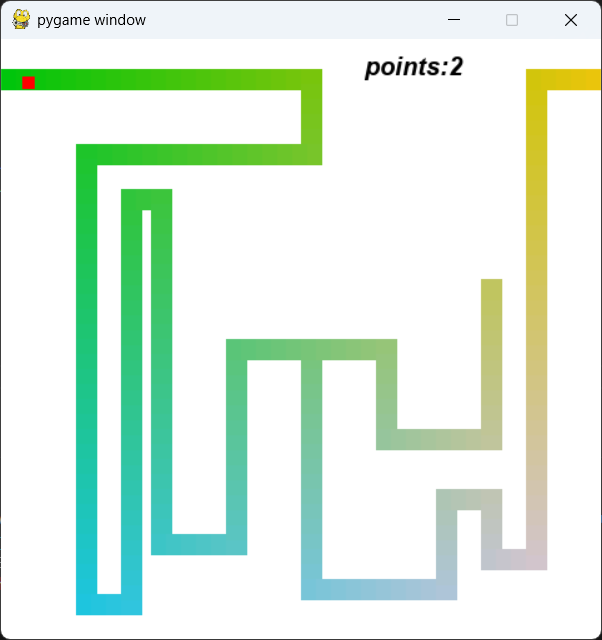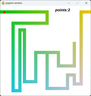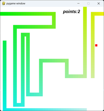 snake game that changes color over time and position on the map as it eats apples and grows in size, made in python
